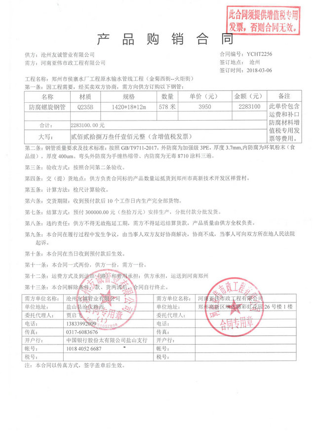河南亞偉市政工程有限公司和我公司已經是長期戰略合作,與趙總已經合作7年之久,2019年3月份從我公司采購DN1400防腐管道,合作的基礎源于彼此的信任,然而能夠長期穩定發展更離不開誠信,我們友誠公司本著友善合作,誠信為本的原則服務好每一位信任我們的人,與您的建交從此刻開始