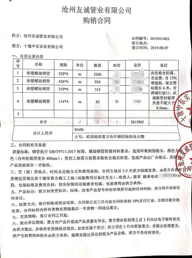 湖北十堰中東實(shí)業(yè)有限公司與我公司簽訂的管廊工程用內(nèi)外涂塑復(fù)合鋼管合同,我公司確保質(zhì)量為原則,保障工期為根本,贏得了客戶的好評(píng),通過我們不斷的努力十堰管廊工程我們又合作的另外兩個(gè)標(biāo)段